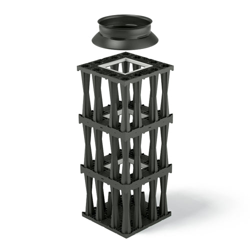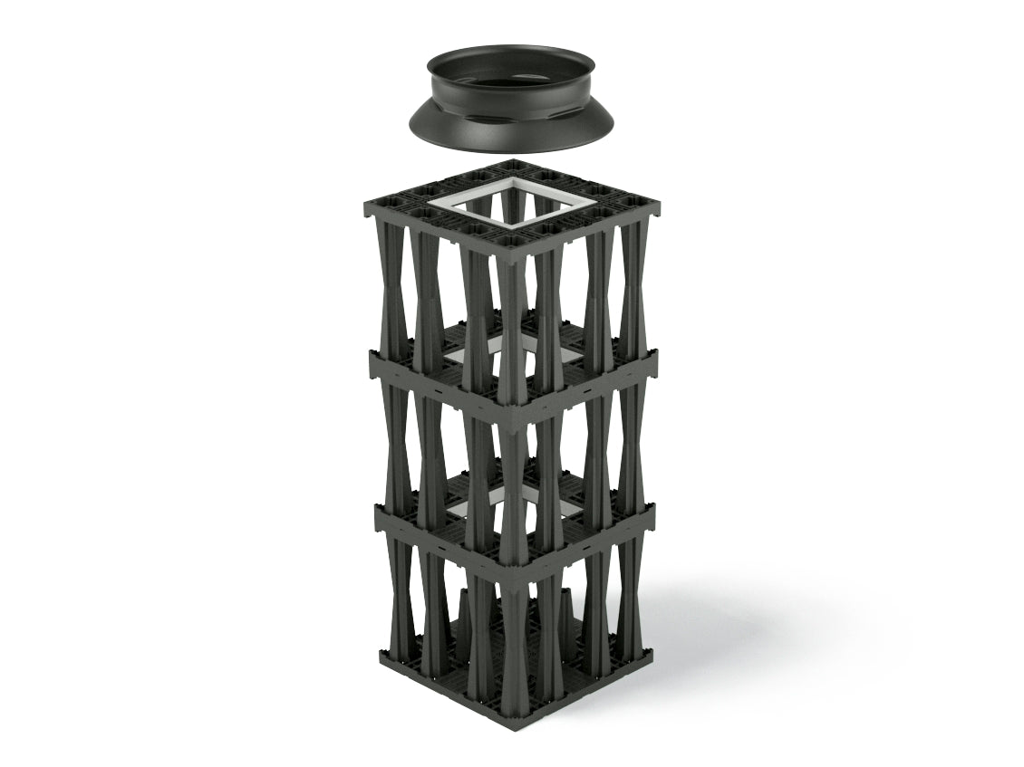 Bodengrube aus Kunststoff (PP). Rechteckig mit Kegel. Kann überall zwischen den Versickerungskisten platziert werden. Durchmesser Kegel 600 mm (freier Durchgang 500 mm). Das System ermöglicht einen breiten Zugang zum Inspektionstunnel von oben. Dadurch kann der Inspektionstunnel ohne Hindernisse inspiziert und gereinigt werden. Gewicht 64kg