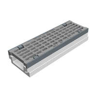 Typ M gemäß NEN EN 1433. Hochwertiger Faserbeton C35/45. Mit 5 mm Gusskantenschutz. Ausgestattet mit gusseisernem Langstangengitter, Öffnung 26/12 mm mit patentiertem schraubenlosen Langstangenschloss. Einlaufquerschnitt 392 cm2/m. Innenbreite 100 mm. Außenmaße LxBxH=500x158/164x80mm. Kiwa-Zertifikat gemäß BRL 5070. Mit CE-Kennzeichnung versehen. Gewicht 18kg.