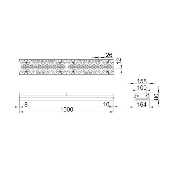 Typ M gemäß NEN EN 1433. Hochwertiger Faserbeton C35/45. Mit 5 mm Gusskantenschutz. Ausgestattet mit gusseisernem Langstangengitter, Öffnung 26/12 mm mit patentiertem schraubenlosen Langstangenschloss. Einlaufquerschnitt 384 cm2/m. Innenbreite 100 mm. Außenmaße LxBxH=1000x158/164x80mm. Kiwa-Zertifikat gemäß BRL 5070. Mit CE-Kennzeichnung versehen. Gewicht 35kg.