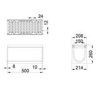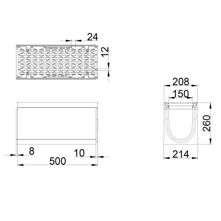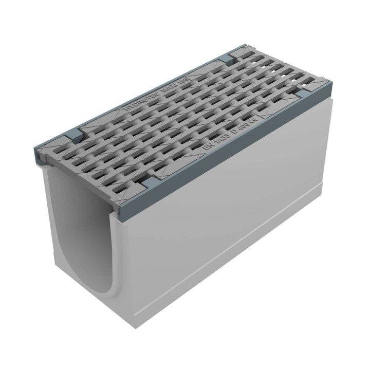 Typ M gemäß NEN EN 1433. Hochwertiger Faserbeton C35/45. Mit 5 mm Gusskantenschutz. Ausgestattet mit gusseisernem Langstangengitter, Öffnung 24/12 mm mit patentiertem schraubenlosen Langstangenschloss. Einlaufquerschnitt 516 cm2/m. Innenbreite 150 mm. Außenmaße LxBxH=500x208/214x260mm. Kiwa-Zertifikat gemäß BRL 5070. Mit CE-Kennzeichnung versehen. Gewicht 38kg.