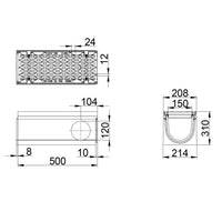 Typ M gemäß NEN EN 1433. Hochwertiger Faserbeton C35/45. Passend für Eck- und T-Stück. Ausgestattet mit 2 seitlichen Bohrungen 160 mm und 1 Endkappe. Mit 5mm Kantenschutz aus Gusseisen. Ausgestattet mit gusseisernem Langstangengitter, Öffnung 24/12 mm mit patentiertem schraubenlosen Langstangenschloss. Einlaufquerschnitt 516 cm2/m. Innenbreite 150 mm. Außenmaße LxBxH=500x208/214x310mm. Kiwa-Zertifikat gemäß BRL 5070. Mit CE-Kennzeichnung versehen. Gewicht 40kg.