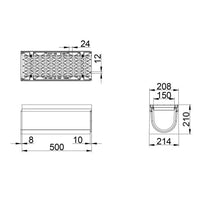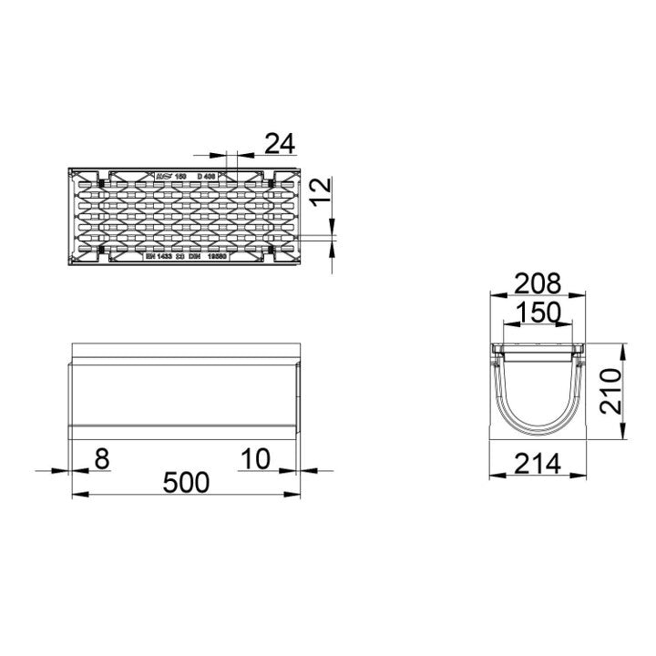 Typ M gemäß NEN EN 1433. Hochwertiger Faserbeton C35/45. Mit 5 mm Gusskantenschutz. Ausgestattet mit Gusseisen-Langstangengitter, Öffnung 24/12 mm mit patentiertem schraubenlosen Langstangenschloss. Einlaufquerschnitt 516 cm2/m. Innenbreite 150 mm. Außenmaße LxBxH=500x208/214x210mm. Kiwa-Zertifikat gemäß BRL 5070. Mit CE-Kennzeichnung versehen. Gewicht 35kg.