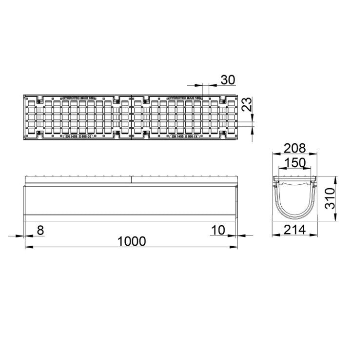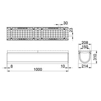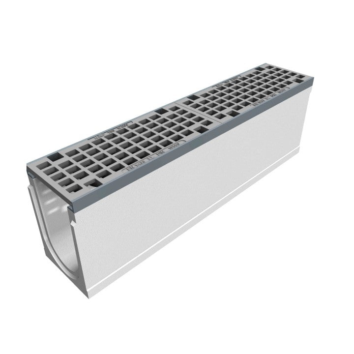 Typ M gemäß NEN EN 1433. Hochwertiger Faserbeton C35/45. Mit 5 mm Gusskantenschutz. Ausgestattet mit Gitterrost aus Gusseisen, Öffnung 30/23 mm mit patentierter schraubenloser Langstangenverriegelung. Einlaufquerschnitt 856 cm2/m. Innenbreite 150 mm. Außenmaße LxBxH=1000x208/214x310mm. Kiwa-Zertifikat gemäß BRL 5070. Mit CE-Kennzeichnung versehen. Gewicht 99kg.