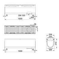 Typ M gemäß NEN EN 1433. Hochwertiger Faserbeton C35/45. Mit 5mm Kantenschutz aus Gusseisen. Bodenablauf mit Dichtungsring 160 mm. Ausgestattet mit Gitterrost aus Gusseisen, Öffnung 26/12 mm mit patentierter schraubenloser Langstangenverriegelung. Einlaufquerschnitt 610 cm2/m. Innenbreite 200 mm. Außenmaße LxBxH=1000x258/264x310mm. Kiwa-Zertifikat gemäß BRL 5070. Mit CE-Kennzeichnung versehen. Gewicht 108kg.