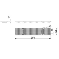 Geprüft nach DIN EN 1433. Öffnung 30/10 mm mit patentierter schraubenloser Langstangenverriegelung. Einlaufquerschnitt 1272 cm2/m. Außenmaße LxBxH=1000x198x20mm. Gewicht 7,2 kg.