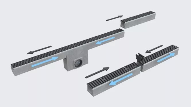 - Horizontal loads from traffic or the thermal behaviour of the pavement must be absorbed by a sufficiently dimensioned concrete lining of the gutter bodies and by expansion joints that are applied in the longitudinal direction of the gutter, in particular in adjacent concrete surfaces. Joints transverse to the gutter series must always be applied to the gutter joint. The installation direction of the gutters always runs against the flow direction and starts at the connection to the sewer.