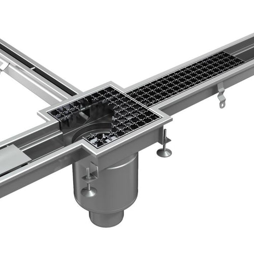 External width 350 mm, internal width 250 mm, support edge 300 mm. Material Stainless steel AISI 304 (1.4301), Plate thickness 2 mm. Reverse pleated U-edge (outer edge). solid stainless steel full material edge reinforcement against mechanical and thermal stress according to EHEDG. Longitudinal and transverse slope provided with 0.5%/m, 1%/m or other. Bent, flat or rounded bottom. Round intermediate bars in the gutter from a height of 80mm, adjustable feet and concrete anchors. Strands (>= 4000mm) connected by means of screwable EPDM coupling flanges. Grille width 297 mm, length 500 mm or 1000 mm. Load class L 15 kN according to EN 1253 (passenger traffic). Pickled by immersion and passivated finish.