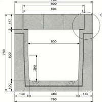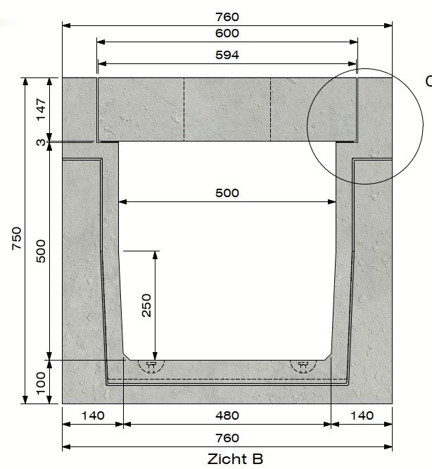 Zelfdragend type I. Inwendige afmeting bxh=50x50cm (uitwendige afmeting bxh=76x74cm). Werkende lengte 1m. Belastingsklasse D400 conform EN1433. Betonnen randprofiel. Gewapend zelfverdichtend beton C60/75. Omgevingsklassen XD3-XF4-XC4-XA3. Duurzaamheid W+R. Verbinding tand/groef. Hijsvoorziening kogelkopankers type DEHA. Plaatsingsvoorschrift volgens opgave producent. Normering conform EN1433. T.b.v. inliggend deksel. Gewicht 555kg. Industrieel grijs beton, geen architectonisch beton. Kleurschakeringen en luchtbelvorming mogelijk. In een industriële omgeving en/of bij zeer intensief gebruik raden wij de uitvoering met gegalvaniseerd randprofiel aan.