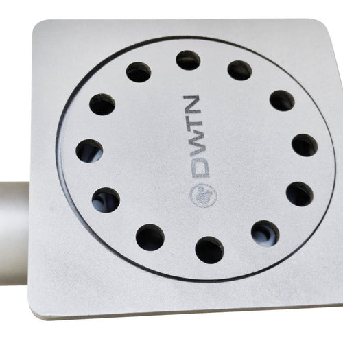Vloerput / Klokput WD300/110H1. Afmeting 300 x 300 mm. Hoogte puthuis 110 mm. Totale hoogte 225 mm. Materiaal RVS 304 (1.4301). Plaatdikte rooster 10 mm. Rond puthuis diameter 231 mm, plaatdikte 1.5 mm. Belasting B, 125kN volgens EN1433. Debiet 2,5 l/s of 150 l/ min. Afwerking gebeitst door onderdompeling en gepassiveerd.