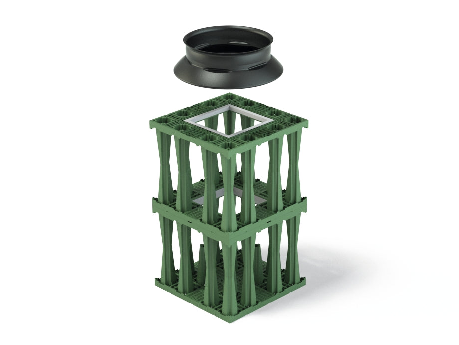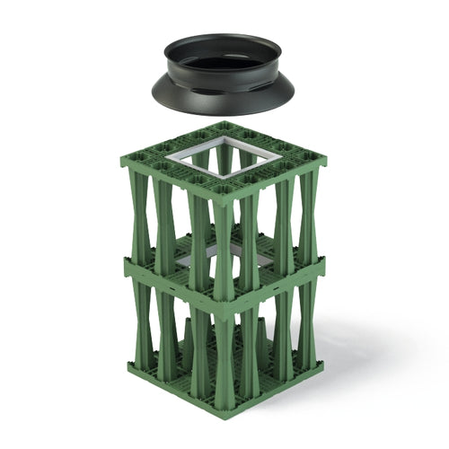 Kunststof (PP) basisput. Rechthoekig met conus. Kan op elke willekeurige plaats tussen de infiltratiekratten worden geplaatst. Diameter conus 600mm (vrije doorgang 500mm). Het systeem maakt een ruime toegang tot de inspectietunnel van bovenaf mogelijk. Zodoende kan de inspectietunnel, zonder belemmeringen, worden geïnspecteerd en gereinigd. Gewicht 44kg
