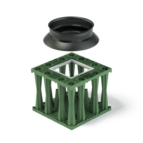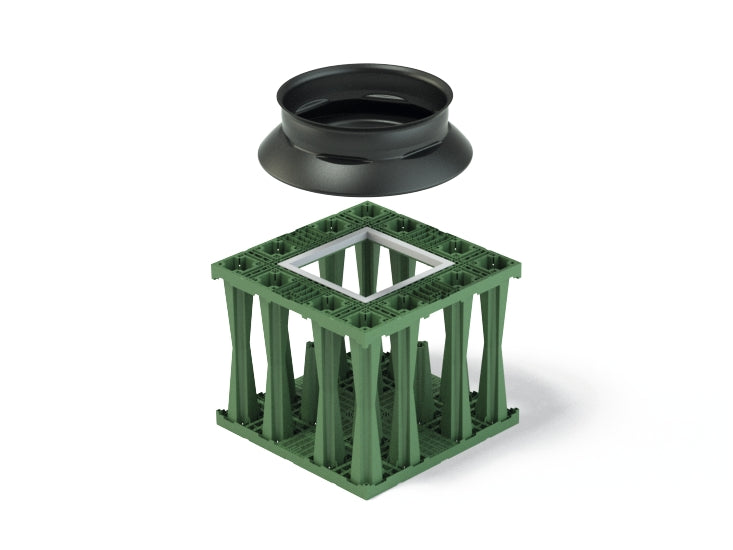 Kunststof (PP) basisput. Rechthoekig met conus. Kan op elke willekeurige plaats tussen de infiltratiekratten worden geplaatst. Diameter conus 600mm (vrije doorgang 500mm). Het systeem maakt een ruime toegang tot de inspectietunnel van bovenaf mogelijk. Zodoende kan de inspectietunnel, zonder belemmeringen, worden geïnspecteerd en gereinigd. Gewicht 24kg