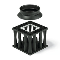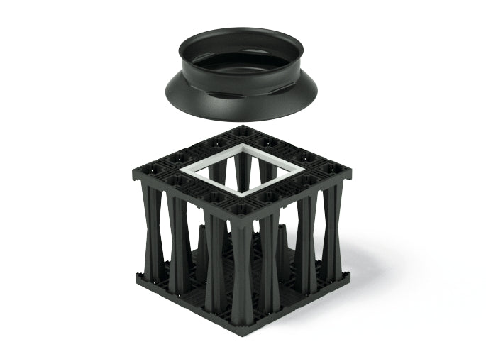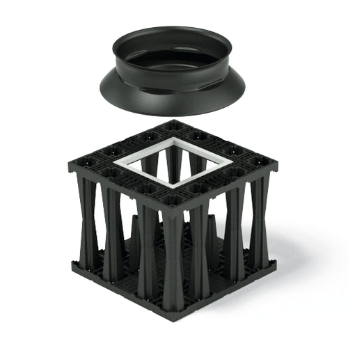 Kunststof (PP) basisput. Rechthoekig met conus. Kan op elke willekeurige plaats tussen de infiltratiekratten worden geplaatst. Diameter conus 600mm (vrije doorgang 500mm). Het systeem maakt een ruime toegang tot de inspectietunnel van bovenaf mogelijk. Zodoende kan de inspectietunnel, zonder belemmeringen, worden geïnspecteerd en gereinigd. Gewicht 24kg