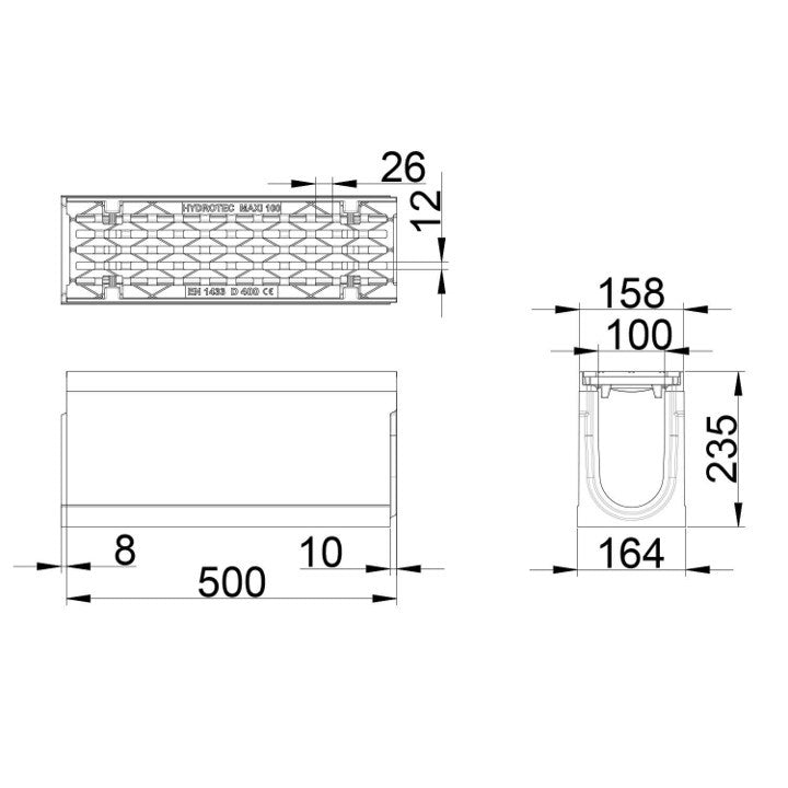 Type M volgens NEN EN 1433. Hoogwaardig vezelversterkt beton C35/45. Met 5mm gietijzeren randbescherming. Voorzien van gietijzer langstaafrooster, opening 26/12mm met gepatenteerde schroefloze langstaaf vergrendeling. Inlaat doorsnede 384 cm2/m. Inwendige breedte 100mm. Uitwendige afmetingen lxbxh=500x158/164x235mm. Kiwa certificaat conform BRL 5070. Voorzien van CE-markering. Gewicht 31kg.