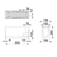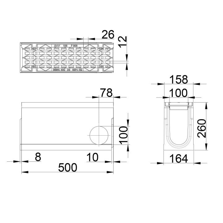 Type M volgens NEN EN 1433. Hoogwaardig vezelversterkt beton C35/45. Geschikt voor hoek- en T-stuk. Voorzien van 2 zijdelingse boringen 100mm en 1 eindkap. Met 5mm gietijzeren randbescherming. Voorzien van gietijzer langstaafrooster, opening 26/12mm met gepatenteerde schroefloze langstaaf vergrendeling. Inlaat doorsnede 392 cm2/m. Inwendige breedte 100mm. Uitwendige afmetingen lxbxh=500x158/164x260mm. Kiwa certificaat conform BRL 5070. Voorzien van CE-markering. Gewicht 33kg.