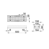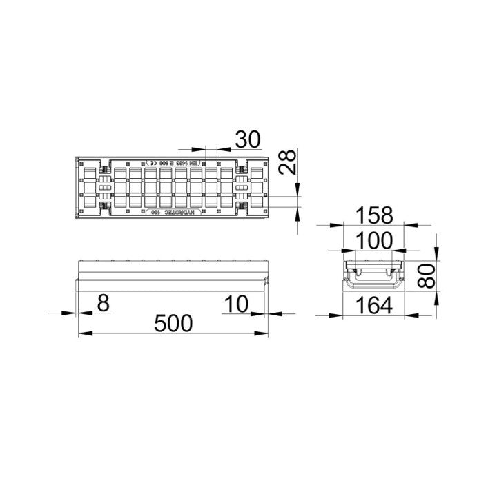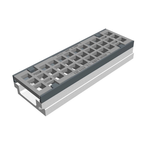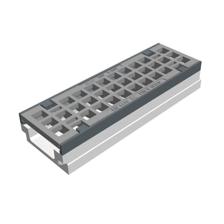 Type M volgens NEN EN 1433. Hoogwaardig vezelversterkt beton C35/45. Met 5mm gietijzeren randbescherming. Voorzien van gietijzer maasrooster, opening 30/28mm met gepatenteerde schroefloze langstaaf vergrendeling. Inlaat doorsnede 552 cm2/m. Inwendige breedte 100mm. Uitwendige afmetingen lxbxh=500x158/164x80mm. Kiwa certificaat conform BRL 5070. Voorzien van CE-markering. Gewicht 16kg.