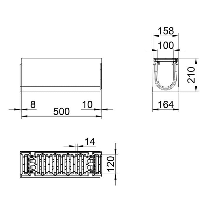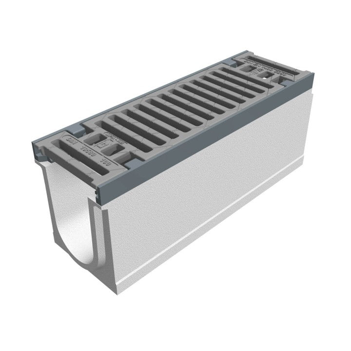Type M volgens NEN EN 1433. Hoogwaardig vezelversterkt beton C35/45. Met 5mm gietijzeren randbescherming. Voorzien van gietijzer sleufrooster, opening 14mm met gepatenteerde schroefloze langstaaf vergrendeling. Inlaat doorsnede 554 cm2/m. Inwendige breedte 100mm. Uitwendige afmetingen lxbxh=500x158/164x210mm. Kiwa certificaat conform BRL 5070. Voorzien van CE-markering. Gewicht 27kg.