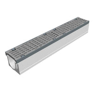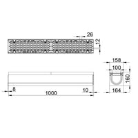 Type M volgens NEN EN 1433. Hoogwaardig vezelversterkt beton C35/45. Met 5mm gietijzeren randbescherming. Voorzien van gietijzer langstaafrooster, opening 26/12mm met gepatenteerde schroefloze langstaaf vergrendeling. Inlaat doorsnede 392 cm2/m. Inwendige breedte 100mm. Uitwendige afmetingen lxbxh=1000x158/164x160mm. Kiwa certificaat conform BRL 5070. Voorzien van CE-markering. Gewicht 51kg.