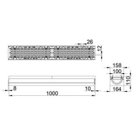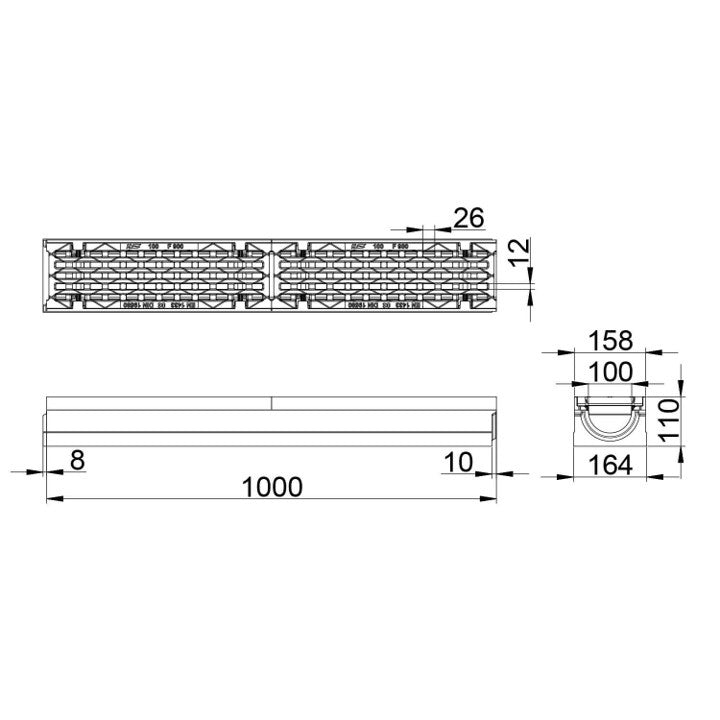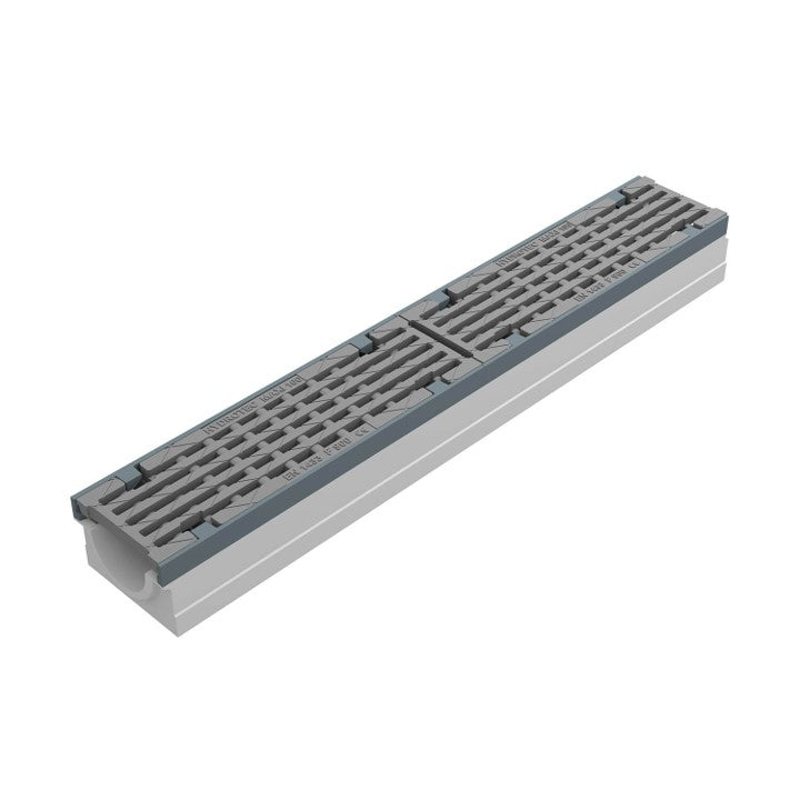 Type M volgens NEN EN 1433. Hoogwaardig vezelversterkt beton C35/45. Met 5mm gietijzeren randbescherming. Voorzien van gietijzer langstaafrooster, opening 26/12mm met gepatenteerde schroefloze langstaaf vergrendeling. Inlaat doorsnede 392 cm2/m. Inwendige breedte 100mm. Uitwendige afmetingen lxbxh=1000x158/164x110mm. Kiwa certificaat conform BRL 5070. Voorzien van CE-markering. Gewicht 41kg.