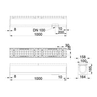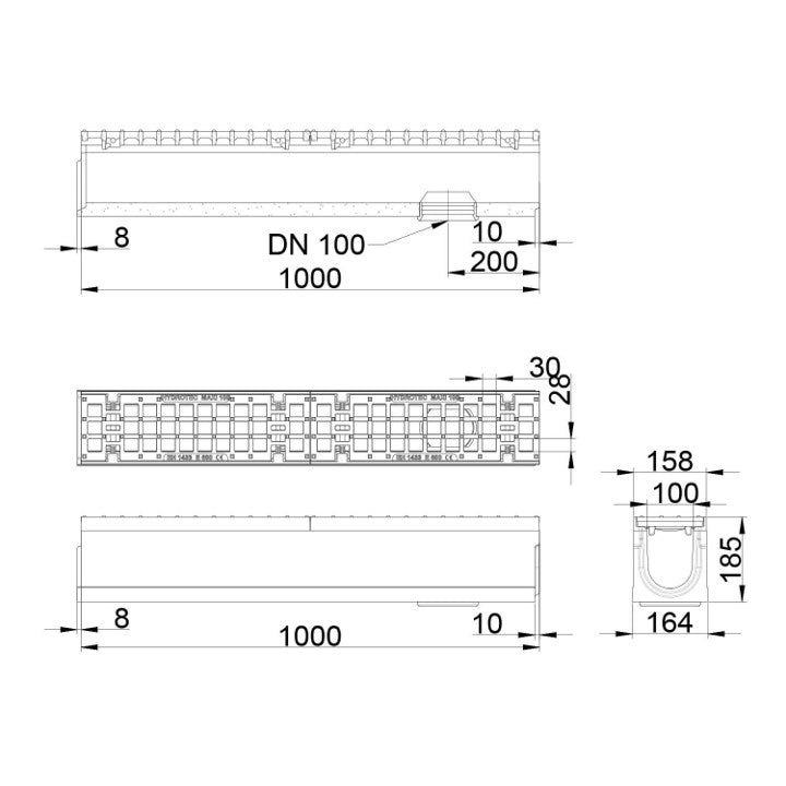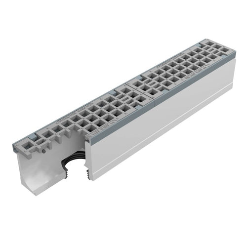 Type M volgens NEN EN 1433. Hoogwaardig vezelversterkt beton C35/45. Met 5mm gietijzeren randbescherming. Onderafvoer met afdichtingsring 110mm. Voorzien van gietijzer maasrooster, opening 30/28mm met gepatenteerde schroefloze langstaaf vergrendeling. Inlaat doorsnede 552 cm2/m. Inwendige breedte 100mm. Uitwendige afmetingen lxbxh=1000x158/164x185mm. Kiwa certificaat conform BRL 5070. Voorzien van CE-markering. Gewicht 50kg.