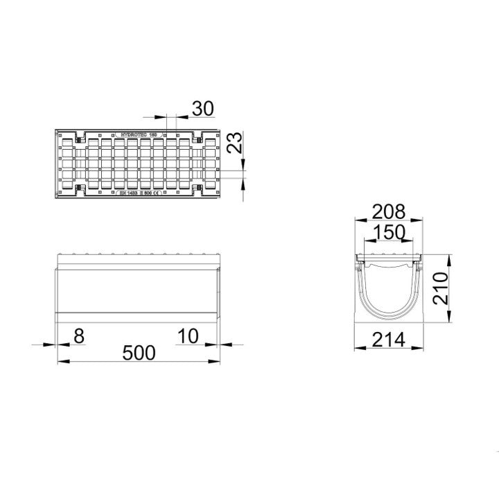 Type M volgens NEN EN 1433. Hoogwaardig vezelversterkt beton C35/45. Met 5mm gietijzeren randbescherming. Voorzien van gietijzer maasrooster, opening 30/23mm met gepatenteerde schroefloze langstaaf vergrendeling. Inlaat doorsnede 856 cm2/m. Inwendige breedte 150mm. Uitwendige afmetingen lxbxh=500x208/214x210mm. Kiwa certificaat conform BRL 5070. Voorzien van CE-markering. Gewicht 35kg.