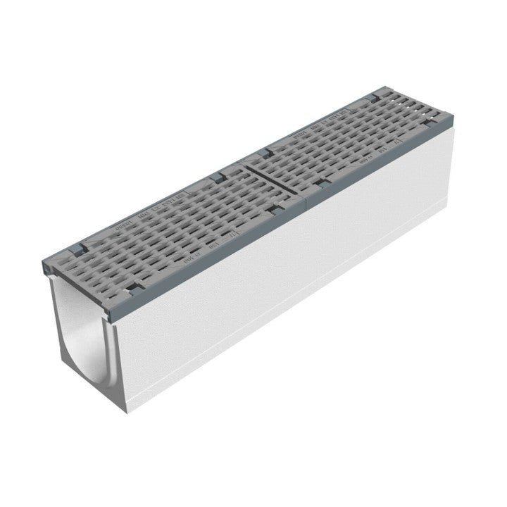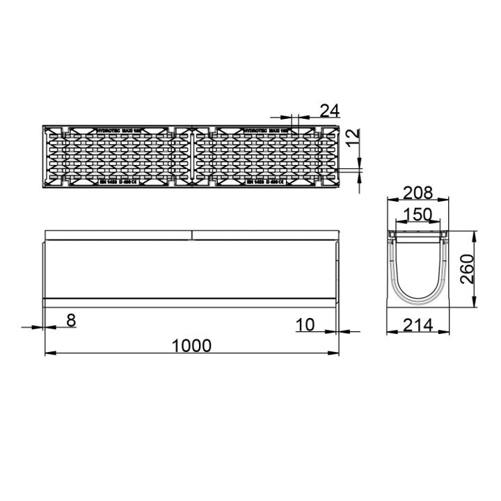 Type M volgens NEN EN 1433. Hoogwaardig vezelversterkt beton C35/45. Met 5mm gietijzeren randbescherming. Voorzien van gietijzer langstaafrooster, opening 24/12mm met gepatenteerde schroefloze langstaaf vergrendeling. Inlaat doorsnede 516 cm2/m. Inwendige breedte 150mm. Uitwendige afmetingen lxbxh=1000x208/214x260mm. Kiwa certificaat conform BRL 5070. Voorzien van CE-markering. Gewicht 76kg.