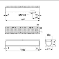 Type M volgens NEN EN 1433. Hoogwaardig vezelversterkt beton C35/45. Met 5mm gietijzeren randbescherming. Onderafvoer met afdichtingsring 160mm. Voorzien van gietijzer langstaafrooster, opening 28/12mm met gepatenteerde schroefloze langstaaf vergrendeling. Inlaat doorsnede 492 cm2/m. Inwendige breedte 150mm. Uitwendige afmetingen lxbxh=1000x208/214x210mm. Kiwa certificaat conform BRL 5070. Voorzien van CE-markering. Gewicht 78kg.