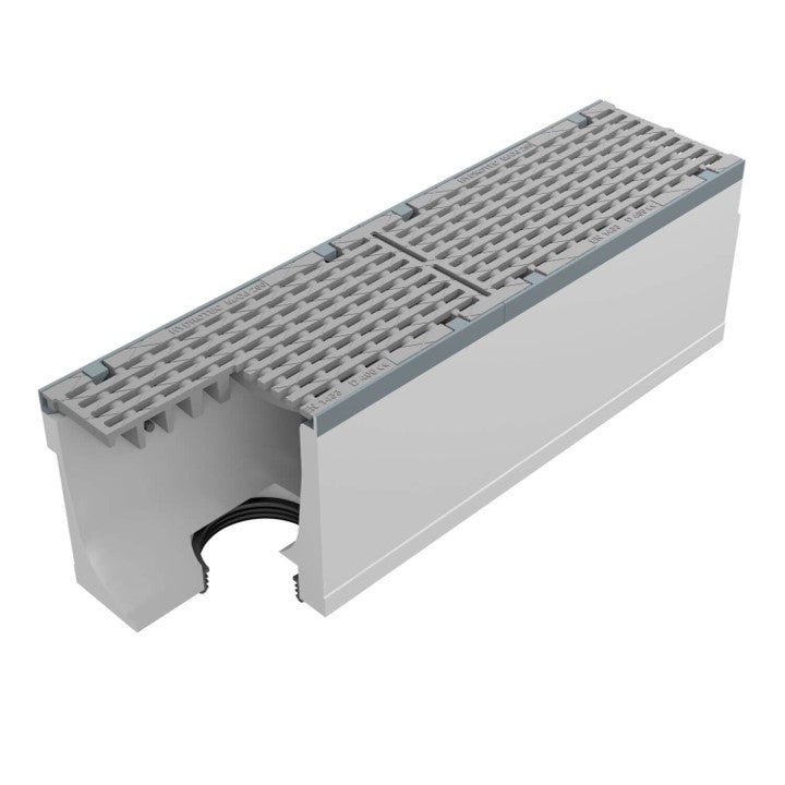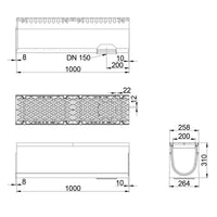 Type M volgens NEN EN 1433. Hoogwaardig vezelversterkt beton C35/45. Met 5mm gietijzeren randbescherming. Onderafvoer met afdichtingsring 160mm. Voorzien van gietijzer langstaafrooster, opening 22/12mm met gepatenteerde schroefloze langstaaf vergrendeling. Inlaat doorsnede 610 cm2/m. Inwendige breedte 200mm. Uitwendige afmetingen lxbxh=1000x258/264x310mm. Kiwa certificaat conform BRL 5070. Voorzien van CE-markering. Gewicht 102kg.