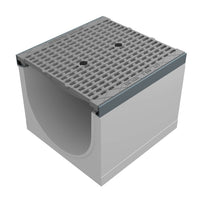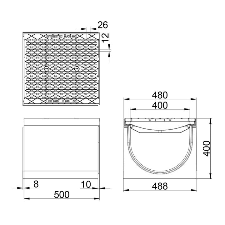 Type M volgens NEN EN 1433. Hoogwaardig vezelversterkt beton C35/45. Met 5mm gietijzeren randbescherming en geintegreerd geluiddempend inlegstuk. Voorzien van gietijzer langstaafrooster, opening 26x12mm, vastgeschroefd met beschermingskap. Inlaat doorsnede 1330 cm2/m. Inwendige breedte 400mm. Uitwendige afmetingen lxbxh=500x480/488x400mm. Kiwa certificaat conform BRL 5070. Voorzien van CE-markering. Gewicht 135kg.