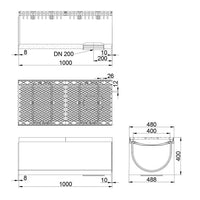 Type M volgens NEN EN 1433. Hoogwaardig vezelversterkt beton C35/45. Met 5mm gietijzeren randbescherming en geintegreerd geluiddempend inlegstuk. Onderafvoer met afdichtingsring 200mm. Voorzien van gietijzer langstaafrooster, opening 26x12mm, vastgeschroefd met beschermingskap. Inlaat doorsnede 1330 cm2/m. Inwendige breedte 400mm. Uitwendige afmetingen lxbxh=1000x480/488x400mm. Kiwa certificaat conform BRL 5070. Voorzien van CE-markering. Gewicht 248kg.