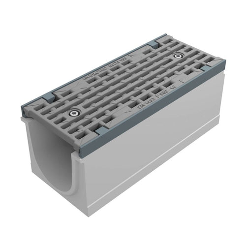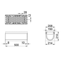 Type M volgens NEN EN 1433. Hoogwaardig vezelversterkt beton C35/45. Met 5mm gietijzeren randbescherming. Voorzien van gietijzer langstaafrooster, opening 28/12mm. Geschroefde vergrendeling door vier bouten per meter voor extreme belastingen en een stevige greep van het rooster in de goot. Inlaat doorsnede 518 cm2/m. Inwendige breedte 150mm. Uitwendige afmetingen lxbxh=500x208/214x210mm. Kiwa certificaat conform BRL 5070. Voorzien van CE-markering. Gewicht 41kg.