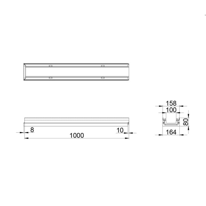 Type M volgens NEN EN 1433. Hoogwaardig vezelversterkt beton C35/45. Met 4mm verzinktstalen randbescherming. Inwendige breedte 100mm. Uitwendige afmetingen lxbxh=1000x158/164x80mm. Kiwa certificaat conform BRL 5070. Voorzien van CE-markering. Gewicht 15kg.