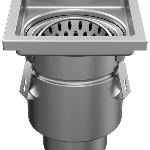 RVS AISI 304 (1.4301). een plaatdikte van 1.5 mm. Het ronde puthuis. diameter 157mm is naadloos diepgetrokken en heeft afgeronde hoeken ter hoogte van de bodemplaat. Inspecteerbare stankslot. EPDM dichting, volgens de Europese norm EN 1253. Het puthuis en stankslot (debiet 1,8 l/s) zijn zo ontworpen dat er geen vuilwater in het putlichaam blijft staan, doch enkel in het stankslot volgens EHEDG. De hoogte van het waterslot bedraagt 50 mm volgens EN1253. Het bovenvlak is vierkant, 200 x 200 mm. Geperst bovenvlak zonder lasnaden en afgeronde hoeken. De buitenranden zijn geplooid in een omgekeerde geplooide U-rand. massieve RVS volmateriaal randversterking tegen mechanische en thermische belasting volgens EHEDG. De afvoerput heeft een vuilvangemmer (capaciteit 0.5 l). handgreep. Het geheel is na plooien en lassen gebeitst door onderdompeling en gepassiveerd. De afvoerput is voorzien van stelschroeven en verankering.