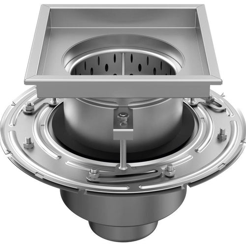 RVS AISI 304 (1.4301). een plaatdikte van 1.5 mm. Het ronde puthuis. diameter 295mm, telescopisch roosteropzetstuk. diameter 255mm is naadloos diepgetrokken en heeft afgeronde hoeken ter hoogte van de bodemplaat. Het is regelbaar in hoogte tussen 90 en 145 mm, het is draaibaar over 360° en 6° kantelbaar. Inspecteerbare stankslot. EPDM dichting, volgens de Europese norm EN 1253. Het puthuis en stankslot (debiet 5.7 l/s) zijn zo ontworpen dat er geen vuilwater in het putlichaam blijft staan, doch enkel in het stankslot volgens EHEDG. De hoogte van het waterslot bedraagt 50 mm volgens EN1253. klemflens, 100 mm breed en dichtings- en drainagering. Het bovenvlak is vierkant, 300 x 300 mm. Geperst bovenvlak zonder lasnaden en afgeronde hoeken. De buitenranden zijn geplooid in een omgekeerde geplooide U-rand. massieve RVS volmateriaal randversterking tegen mechanische en thermische belasting volgens EHEDG. De afvoerput heeft een vuilvangemmer (capaciteit 2.9 l). handgreep. Het geheel is na plooien en lassen gebeitst door onderdompeling en gepassiveerd. De afvoerput is voorzien van stelschroeven, verankering en aarding.