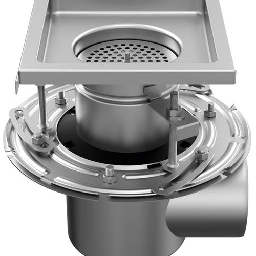 RVS AISI 304 (1.4301). een plaatdikte van 1.5 mm. Het ronde puthuis heeft een diameter van 348mm, telescopisch roosteropzetstuk. diameter 308mm. Het is regelbaar in hoogte tussen 90 en 145 mm, het is draaibaar over 360° en 6° kantelbaar.De afvoerput is voorzien van een horizontale uitloop 200mm en een inspecteerbare stankslot. EPDM dichting, volgens de Europese norm EN 1253. Het puthuis en stankslot (debiet 9 l/s) zijn zo ontworpen dat er geen vuilwater in het putlichaam blijft staan, doch enkel in het stankslot volgens EHEDG. De hoogte van het waterslot bedraagt 50 mm volgens EN1253. klemflens, 100 mm breed en dichtings- en drainagering. Het bovenvlak is vierkant, 400 x 400 mm. De buitenranden zijn geplooid in een omgekeerde geplooide U-rand. massieve RVS volmateriaal randversterking tegen mechanische en thermische belasting volgens EHEDG. De afvoerput heeft een vuilvangemmer (capaciteit 5 l). handgreep. Het geheel is na plooien en lassen gebeitst door onderdompeling en gepassiveerd. De afvoerput is voorzien van stelschroeven en verankering.