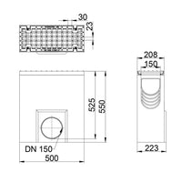 Type M volgens NEN EN 1433. Hoogwaardig vezelversterkt beton C35/45. Met 5mm gietijzeren randbescherming. Inclusief vuilemmer. Voorzien van gietijzer maasrooster, opening 30/23mm met gepatenteerde schroefloze langstaaf vergrendeling. Inlaat doorsnede 856 cm2/m. Inwendige breedte 150mm. Uitwendige afmetingen lxbxh=500x208/223x550mm. Kiwa certificaat conform BRL 5070. Voorzien van CE-markering. Gewicht 67kg.